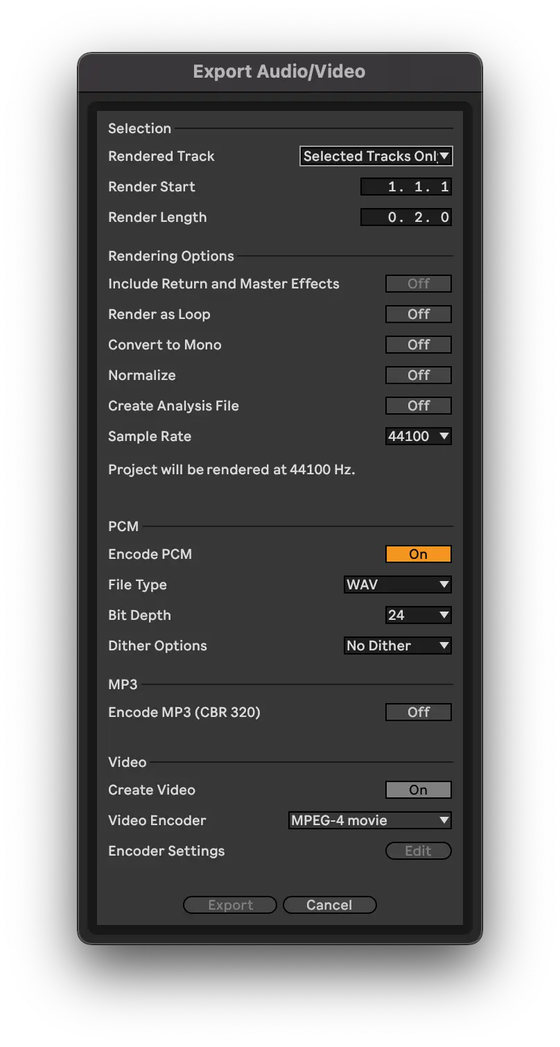 You’ll notice in the previous screenshots the loop braces have been set to the length we want our stems to be. This means we can quickly select the appropriate region to bounce the stems and ensure they have the correct length and start point every time. The next trick is to use the ‘Selected Tracks Only’ function in the bounce settings in Ableton.