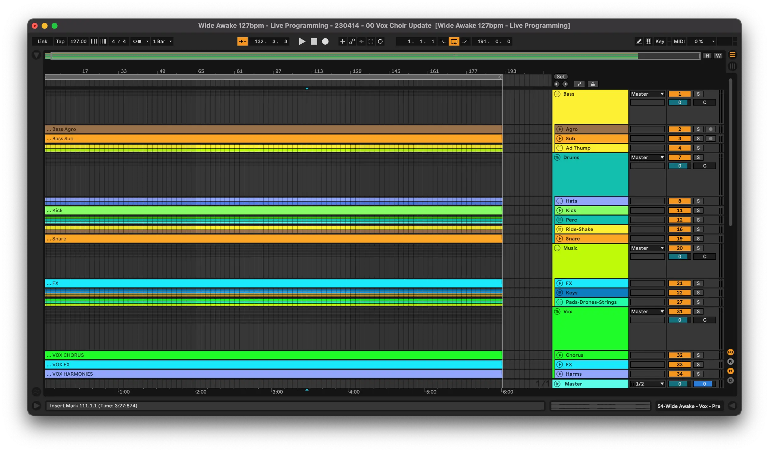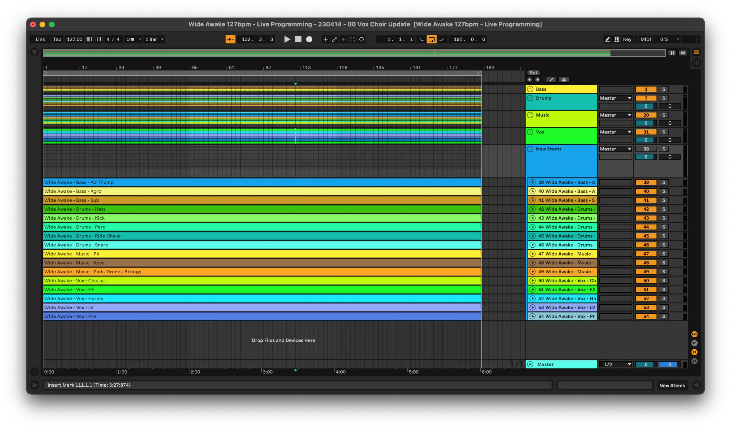Then whatever is contained in this audio file will be played back in the Ableton session that’s pointed to it. If I rebounce this file with the LV part in it then we’ll end up with LV coming down the bass bus. This is unlikely to be a real world scenario but something common is a new snare in the snare group or a BV layer was missing that needs to be added. I’d recommend trying this out with your own sessions. Break some stems, fix them, break them again and understand how DAWs link to the audio files in them.